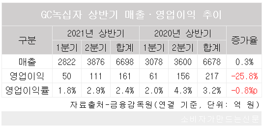 GC녹십자는 연결 기준 올 상반기 영업이익이 161억 원으로, 지난해 상반기보다 25.8% 감소한 것으로 잠정 집계됐다고 지난 30일 공시했다. 같은 기간 매출은 6698억 원으로 제자리 걸음 했다. 이에 따른 영업이익률은 2.4%로 전년동기 대비 0.8%포인트 줄었다.