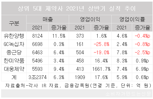 한편 GC녹십자를 비롯한 5대 제약사들의 연결 기준 올 상반기 매출을 보면 유한양행(대표 조욱제)은 8124억 원으로 매출 규모가 가장 컸고 증가율도 11.5%로 가장 높았다. 매출 증가율은 0%대를 기록한 GC녹십자를 제외하고 4개사 모두 양호한 성장세를 보였다.