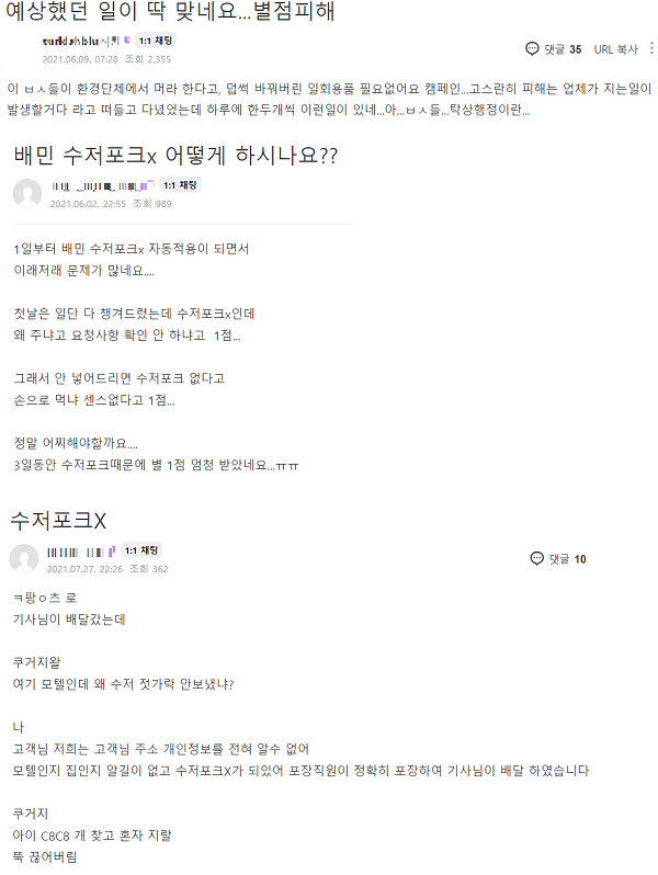 실제로 자영업자 커뮤니티 등에는 "수저를 제공 안 했다는 이유로 별점 테러를 당했다"며 억울함을 호소하거나 피해입지 않도록 수저 받기를 메뉴 기본 옵션으로 설정하는 법을 공유하는 글들이 올라오고 있다.