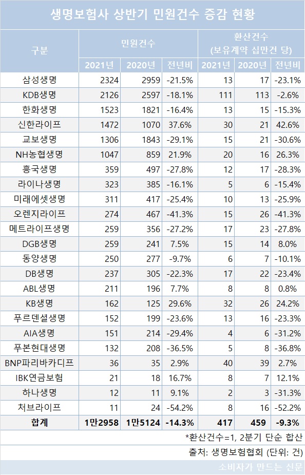 생명보험협회에 따르면 지난 상반기 국내 23개 생명보험사에 접수된 민원건수는 전년 동기 대비 14.3% 감소한 1만2958건을 기록했다.