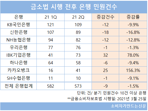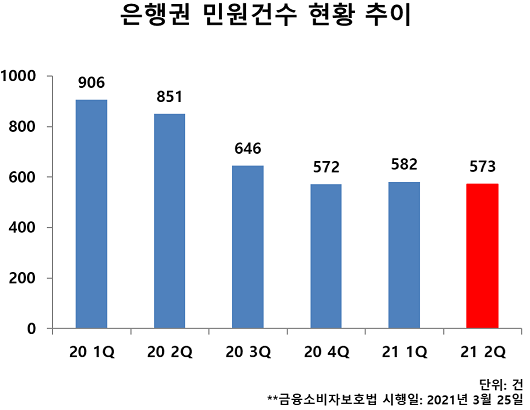 올해 2분기 전 은행권의 민원건수는 전 분기 대비 1.5% 감소한 573건으로 집계됐다. 분기 기준 최근 2년 내 민원건수로는 두 번째로 적었다.