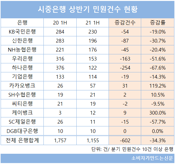 은행연합회에 따르면 올해 상반기 국내 은행 민원건수는 전년 대비 34.3% 감소한 1155건으로 집계됐다.