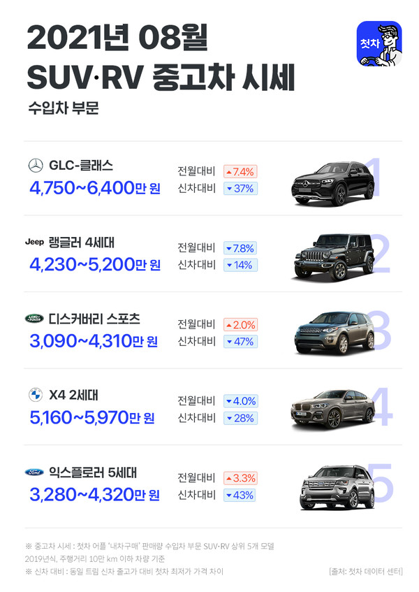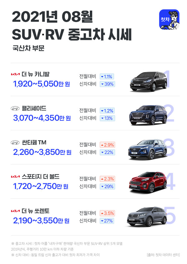 이번에 공개된 중고차 시세는 첫차에서 7월 한 달간 고객이 가장 많이 구매한 SUV·RV 상위 5개 모델을 분석하여 산출한 8월 예상 시세다. 평균 주행거리 10만 km이하의 2019년식 차량을 기준으로 측정했다.