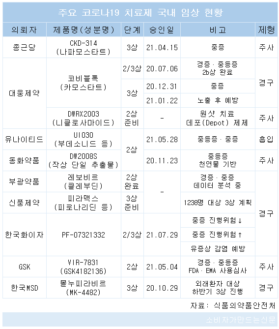 최근 2b상 탑라인(Topline) 결과를 발표한 대웅제약의 코비블록(가칭)을 비롯해 부광약품의 레보비르(클레부딘), 신풍제약의 피라맥스(피로나리딘·알테수네이트) 등이 경구용 제형으로 개발되고 있다. 한국화이자제약 'PF-07321332'와 한국MSD '몰누피라비르' 등도 마찬가지이다.