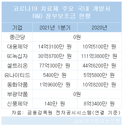 한편 코로나19 치료제 개발사들이 지난해 사용한 정부 R&D 보조금은 GC녹십자가 111억3800만 원으로 가장 많았고 셀트리온이 44억6200만 원으로 뒤를 이었다. 이들 보조금은 코로나19 치료제와 백신, 신약 개발 등에 사용됐다.