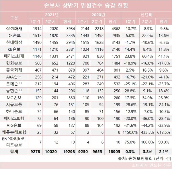 반면 삼성화재와 현대해상의 민원건수는 각각 9.8%와 6.3%의 감소율을 기록했다. 삼성화재의 상반기 민원건수는 3934건으로 자체민원과 대외민원 모두 감소한 것으로 나타났다.