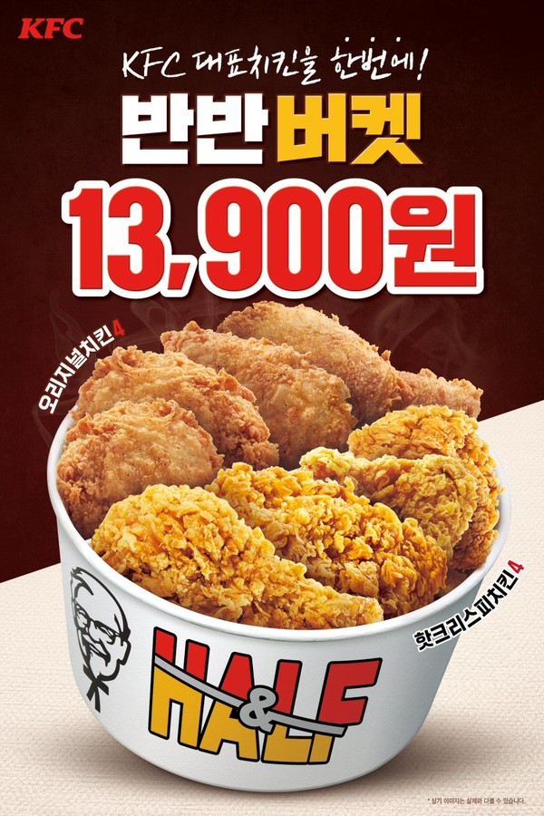 프로모션을 통해 선보이는 치킨은 KFC 대표 시그니처 메뉴인 핫크리스피치킨 4조각과 오리지널치킨 4조각을 담은 '반반버켓' 제품으로, 행사 기간 1만3900원에 할인 판매한다.
