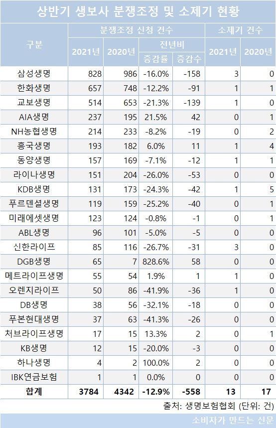 생보사 상반기 분쟁조정 건수 대폭 감소...점유율 1위 삼성생명 최다