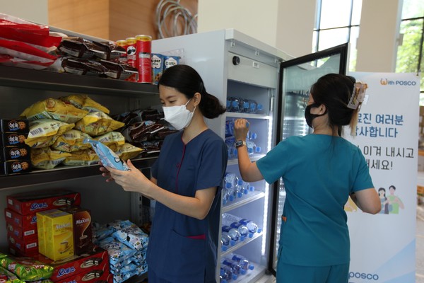 포스코건설은 연이은 폭염과 격무에 시달리는 의료진들이 시원한 음료를 마실 수 있도록 420L 규모의 냉동고 2대를 설치했다. 야간근무가 많고 외출이 불가한 의료진들이 간식을 무료로 이용할 수 있는 미니편의점도 마련했다. 간식은 매주 리필할 계획이다.