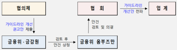 금융위 옴부즈만은 협의체에서 제출한 가이드라인 개선 권고안이 설명의무의 합리적 이행방안인지 검토 후 최종 확정하며 이후 각 협회는 확정된 가이드라인 개선안을 업계에 전파하는 구조다.