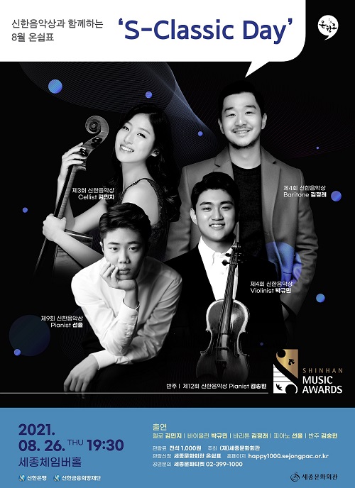 신한은행과 세종문화회관은 진옥동 은행장의 제안으로 지난 6월 문화예술후원 업무협약을 맺고 매년 여름 신한음악상을 통해 배출된 전도유망한 클래식 연주자들의 연주회를 정례화 하기로 한 바 있다. 이에 첫 공연으로 오는 26일 오후 7시30분 세종문화회관 체임버홀에서 S-Classic Day가 열린다.