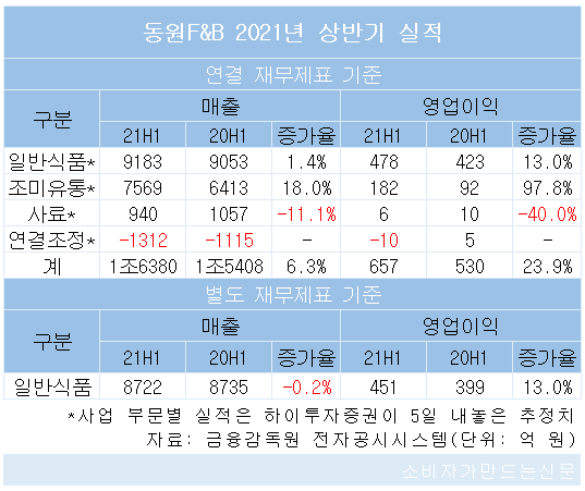 금융감독원 전자공시시스템에 따르면 동원F&B의 올 상반기 매출은 연결 기준 1조6378억 원으로, 지난해 상반기보다 6.3% 성장한 것으로 잠정 집계됐다. 같은 기간 영업이익은 657억 원으로 23.9% 늘었다.