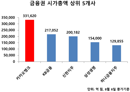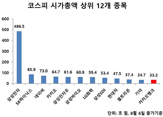 6일 종가기준 카카오뱅크의 시가총액은 33조1620억 원으로 전체 코스피 12위, 금융주 중에서는 1위에 올랐다.