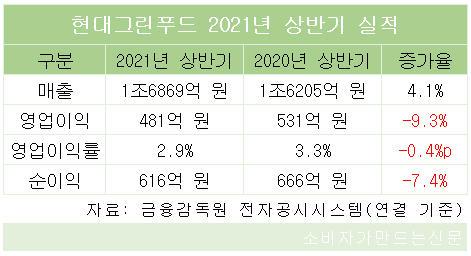 현대그린푸는 연결 기준 올 상반기 매출 1조6869억 원, 영업이익 481억 원, 순이익 616억 원을 기록했다고 9일 공시했다.