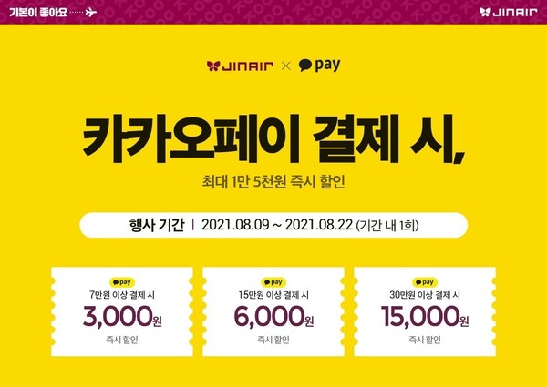 진에어가 22일까지 진에어 홈페이지 및 모바일 앱∙웹에서 카카오페이로 일정 금액 이상을 결제하면 최대 1만 5000원 할인 혜택을 제공하는 '카카오페이 결제 할인 프로모션'을 진행한다.