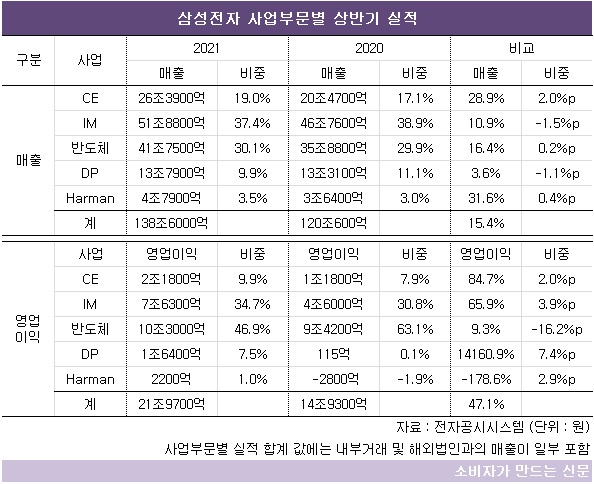 금융감독원 전자공시시스템에 따르면 삼성전자의 올 상반기 사업부문별 총 매출(해외법인과의 내부매출이 일부 포함)은 138조6000억 원이다. 영업이익은 21조9700억 원. 전년 동기 대비 매출은 15.4%, 영업이익은 47.1% 증가했다.