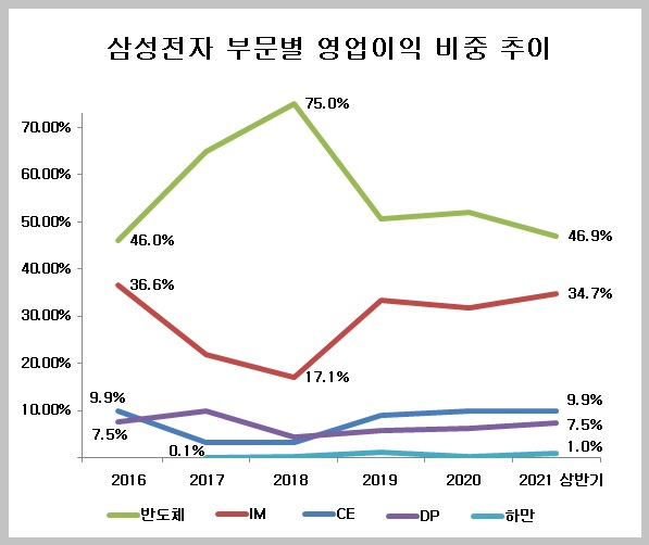 사업부문별로 보면 한때 삼성전자를 먹여 살리던 스마트폰 사업을 담당하는 IM부문의 하락세가 심상치 않다. 2016년 삼성전자 전체 매출의 45%를 차지했던 IM부문은 올해 상반기에 그 비중이 37.4%로 급락했다. 가전사업의 CE부문은 매출 비중이 20% 밑으로 떨어졌고 디스플레이사업을 맡은 DP부문의 비중도 10%선이 깨졌다.