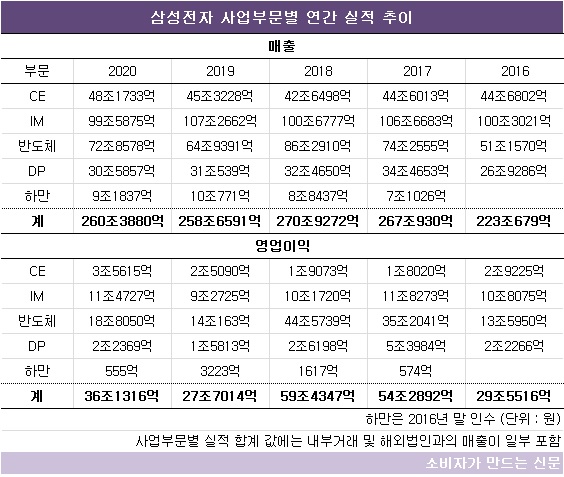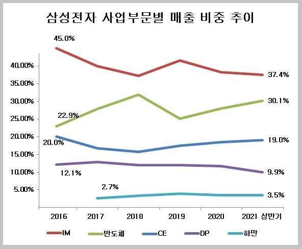 삼성전자의 성장을 주도한 반도체부문은 매출 비중이 22%에서 30%로 급등했고, 2016년 인수한 하만부문은 2017년 2.7%에서 올해 3.5%로 소폭 상승했다.