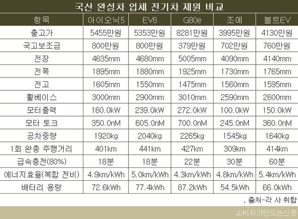 보조금을 고려하면 현대자동차 '아이오닉5'가 제격이고 기아 ‘EV6’는 5종 중 주행거리가 가장 긴 게 장점이다. 가성비를 따지면 르노삼성 '조에'와 한국지엠 '볼트 EV'가 비교 우위에 있다. 럭셔리 전기차를 추구하는 소비자에게는 제네시스 ‘G80e'가 독보적이다.