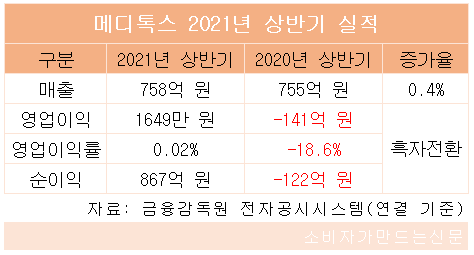 메디톡스는 연결 기준으로 올 상반기 매출 758억 원, 영업이익 1649만 원, 순이익 867억 원을 기록했다고 13일 공시했다.