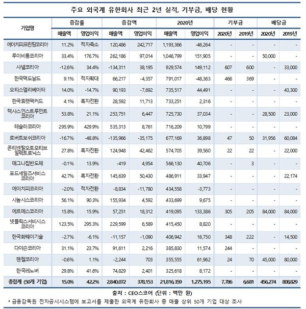 15일 기업평가사이트 CEO스코어(대표 박재권)가 지난해 외국계 유한회사 중 감사보고서를 제출한 매출 상위 50곳의 실적과 투자, 기부, 배당 현황을 분석한 결과, 이들 기업의 지난해 매출액은 21조8164억원으로 2019년보다 15% 증가했다.