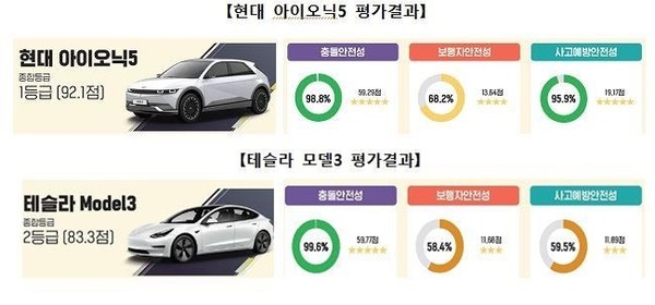 17일 국토교통부는 한국교통안전공단 자동차안전연구원과 함께 자동차안전도평가(KNCAP)를 진행한 결과 아이오닉5는 1등급, 테슬라 모델3는 2등급으로 각각 나타났다고 밝혔다.
