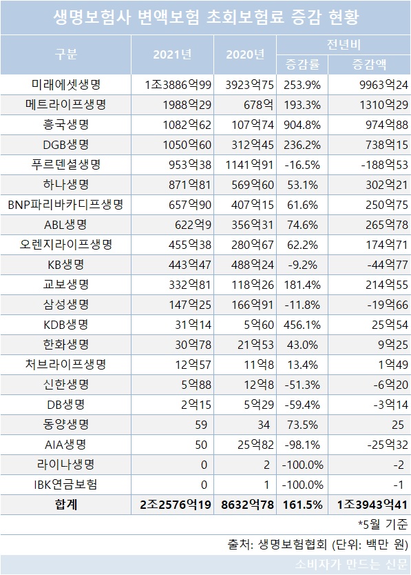 18일 생명보험협회에 따르면 올 들어 지난 5월까지 국내 21개 생명보험사가 판매한 변액보험 초회보험료는 2조2576억1900만 원으로 집계됐다.