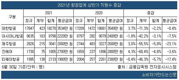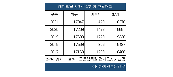 대한항공은 지난 상반기(이하 6월 말 기준) 정규직이 1만7847명으로 전년 동기 1만7209명과 비교해 638명(3.7%) 늘었고 계약직은 423명으로 전년 동기 1472명과 비교해 1049명(71.3%) 줄었다.