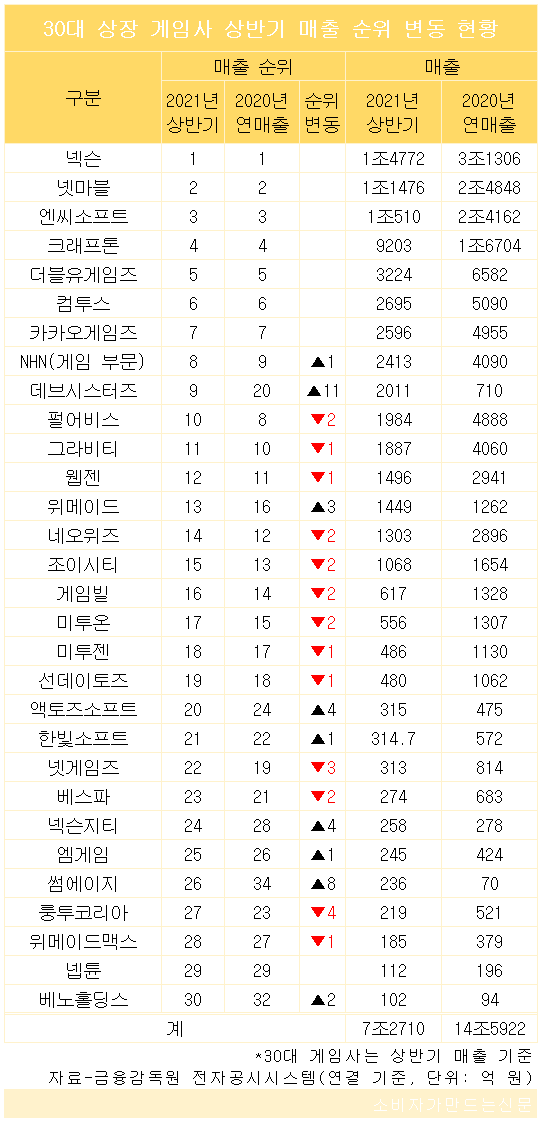 30대 게임사 상반기 매출 순위 1~7위 불변, 데브시스터즈 10위권 진입