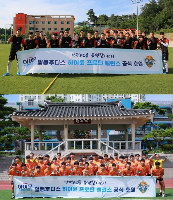 일동후디스는 강원도 강릉에 위치한 강원FC 클럽하우스를 찾아 단백질 건강기능식품 ‘하이뮨 프로틴 밸런스’ 제품을 전달했다. 후원 제품은 프로 선수들을 위한 ‘하이뮨 프로틴 밸런스 프로 액티브’와 유소년 선수단을 위한 ‘하이뮨 프로틴 밸런스 음료’다.