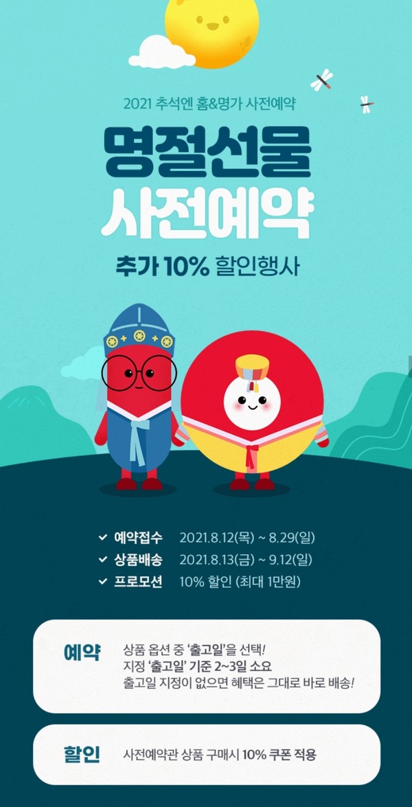홈앤쇼핑 모바일 앱에서 진행되는 이번 ‘추석엔 홈&명가’ 기획전에서는 오는 29일까지 사전예약관 상품 구매 시 10% 할인 쿠폰을 적용해 추석 명절상품을 판매한다.