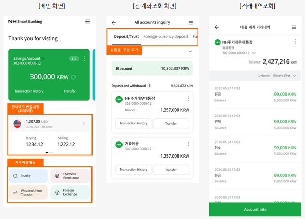 외국인 고객들의 이용 편의를 위해 외국인 고객이 가장 필요로 하는 환율정보와 해외송금, 환전 등 주요기능을 메인화면에 배치하고 전 계좌 조회 기능 및 대표계좌 설정 기능 등을 추가했다.