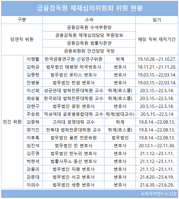 이후 제재심 민간 위원은 19명까지 확대됐지만 전원이 학계와 법조계만으로 구성돼 개편취지를 무색케 하고 있다. 금융당국이 스스로 공언했다 IT분야나 소비자 보호 등에 특화된 전문가는 찾아볼 수 없는 상황이다.