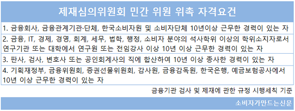 시행세칙에 따르면 제재심 민간위원 자격 조건은 ▲금융회사 및 금융기관, 소비자단체 등에서 10년 이상 근무한 자 ▲금융·IT·경제·소비자·행정 등 분야에서 석사학위 이상 소지자로 관련 연구기관 또는 대학에서 10년 이상 근무한 자 ▲판·검사, 변호사 또는 공인회계사 10년 이상 종사자 ▲기재부·금융위·감사원·금감원·한국은행 등에서 10년 이상 근무한 자로 명시돼있다.
