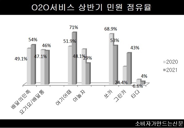 올 상반기 O2O(Online to Offline) 서비스 중 배달앱과 차량공유앱에서는 고객 응대 등 서비스 문제가 가장 많이 제기됐다. 숙박앱에서는 취소·환불에 대한 소비자 피해가 70%가량 차지하며 압도적으로 많았다.