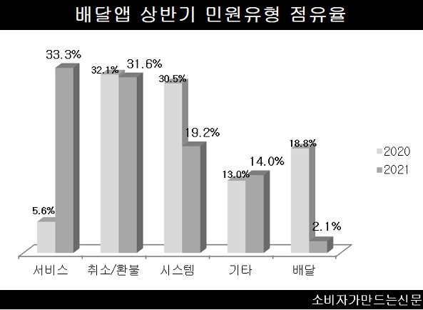 이어 ▲취소·환불(31.6%) ▲시스템(19.2%) ▲기타(14.0%) ▲배달(2.1%) 순으로 집계됐다.