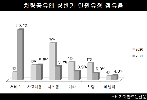 차량공유앱 이용자들도 고객 응대 등 전반적인 서비스에 대한 문제를 가장 많이 제기했다. 지난해 상반기에는 시스템과 차량 등에 대한 불만이 주를 이뤘다면 올해 민원은 ▲서비스(50.4%) ▲사고대응(15.3%) ▲시스템(13.7%) ▲기타(8.9%) ▲차량(6.9%) ▲패널티(4.8%) 순으로 집계됐다.