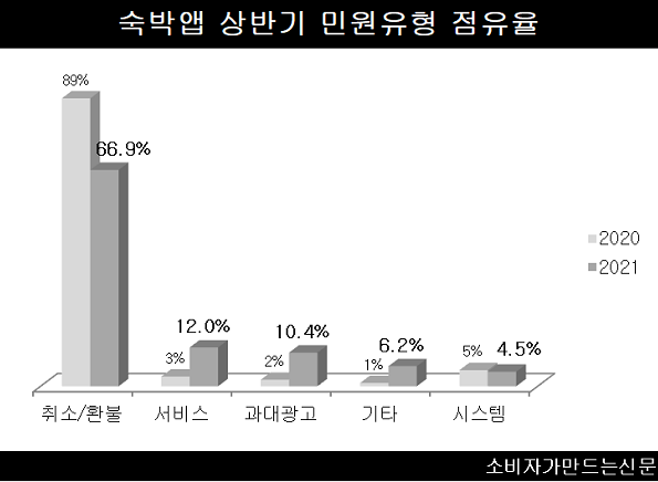 숙박앱은 지난해 취소·환불 문제가 90%에 육박했으나 올해는 67%로 다소 주춤했다. 나머지는 ▲서비스(12%) ▲과대광고(10.4%) ▲기타(6.2%) ▲시스템(4.5%) 등이었다.