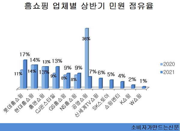 올해 새롭게 조사한 신세계TV쇼핑, SK스토아, 쇼핑엔티, K쇼핑, W쇼핑 등 5개 업체는 민원 점유율만 살펴봤을 때 모두 한자릿수로 몸집과 비례하는 수준이었다.