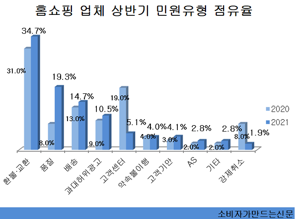 올해 상반기 홈쇼핑 민원은 환불·교환과 품질, 배송, 과대광고에 집중됐다.