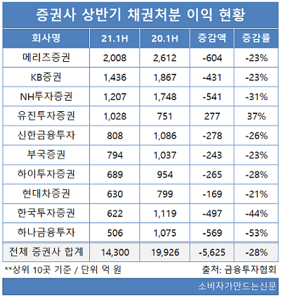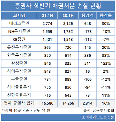 상위 10개 증권사 중 채권처분 손실액이 가장 큰 곳은 메리츠증권이다. 상반기 메리츠증권의 채권처분 손실은 2774억 원으로 전년 2126억 원보다 648억 원(30%) 늘었다.