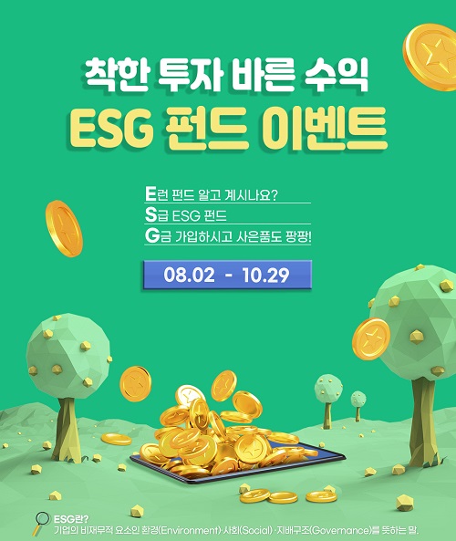KB ESG성장리더스증권투자신탁(주식), BNK지속가능ESG증권투자신탁1호(주식), 미래에셋글로벌혁신기업ESG증권투자신탁(주식), 한국투자글로벌착한기업ESG증권투자신탁(주식-재간접형)등 국내외 ESG펀드 4종 가운데 하나에 가입하고 조건을 충족하면 에코백과 텀블러 등 경품을 제공한다.