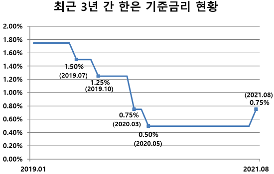 한국은행이 26일 금융통화위원회를 열고 현재 0.5%인 기준금리를 15개월 만에 25bp(0.25%포인트) 인상하기로 결정하면서 대출금리 인상이 현실화할 전망이다.