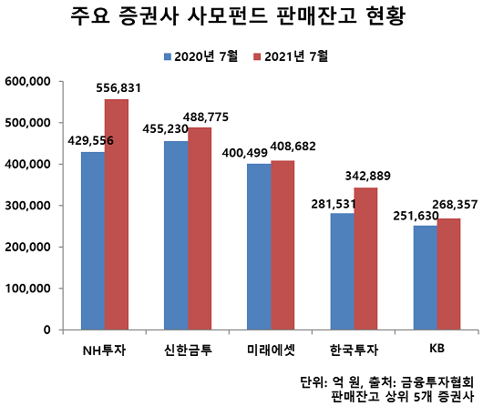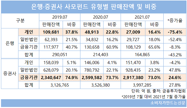 올해 7월 말 기준 증권사 사모펀드 개인투자자 판매잔고는 2년 전 대비 4.2% 감소한 15조1470억 원이었지만 같은 기간 일반법인(47.8%)과 금융기관(24.6%) 판매잔액이 급증하면서 찬바람을 피했다. 특히 판매비중이 가장 높은 금융기관 판매잔고는 같은 기간 234조 원에서 292조 원으로 58조 원 순증했다.