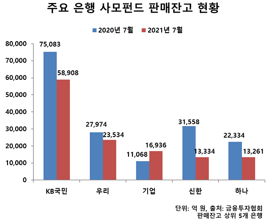 은행권에서는 KB국민은행(행장 허인)이 5조8909억 원으로 가장 많았고 우리은행(행장 권광석)이 2조3534억 원, IBK기업은행(행장 윤종원)이 1조6946억 원으로 뒤를 이었다. 기업은행을 제외하면 전년 대비 사모펀드 잔고가 모두 감소했다.