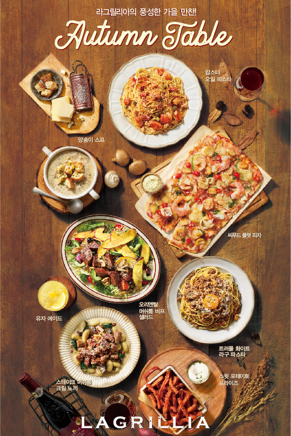 라그릴리아 관계자는 "신선한 식재료에 가을철 입맛을 돋워주는 특별한 레시피를 더해 풍성한 가을 신메뉴를 출시했다. 앞으로도 계절마다 제철 식재료와 라그릴리아만의 레시피로 개성 있는 메뉴를 선보일 것"이라고 말했다.