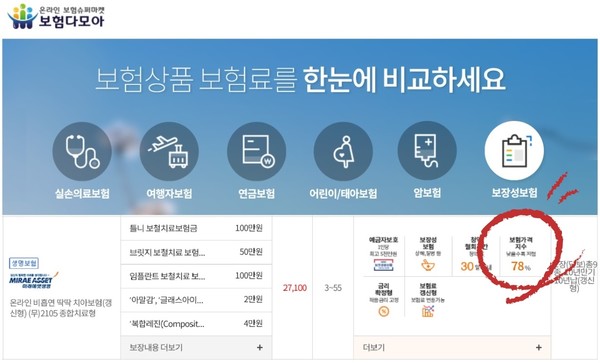 보험다모아는 생명보험협회와 손해보험협회가 공동으로 운영하는 공신력을 갖추고 있는 보험비교플랫폼으로 여러 회사의 보험상품을 종류별로 구분하고 보험료, 보장범위, 특성 등을 정리해 다양한 정보를 제공하고 있다.
