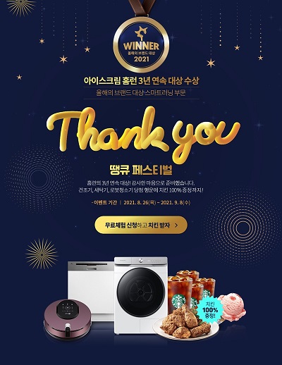 또한 아이스크림 홈런 체험 후기를 작성한 회원들 전원에게는 아이스크림 쿠폰을 제공할 뿐만 아니라 추첨을 통해 집안일 3대 헬퍼로 불리는 건조기, 식기세척기, 로봇청소기를 증정한다.