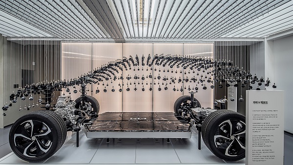 래코드는 샘플링 단계에서 버려지는 EV6 시트 소재와 폐차된 자동차의 부속품 일부, 의류 부자재인 라벨 등을 혼합하여 구의 형태를 만들어냈고, 이를 매달아 실제 E-GMP위에 EV6의 스포티한 디자인 라인을 구현해냈다.