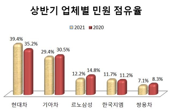 코로나19와 수입차 공세로 판매량이 줄었으나 반도체 수급에 따른 수리 지연문제가 늘어나면서 민원도 증가한 것으로 분석된다.